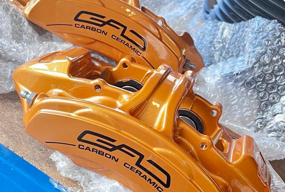 - 6-piston fixed-type brake caliper for the front axle with 402 mm carbon ceramic brake discs.